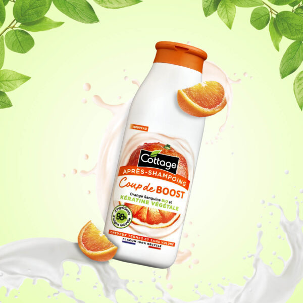 Le shampoing Coup de Boost associe à la kératine végétale un extrait d’orange sanguine bio, riche en antioxydant et vitamine C, pour une formule spécifiquement dédiée aux cheveux ternes et sans volume.