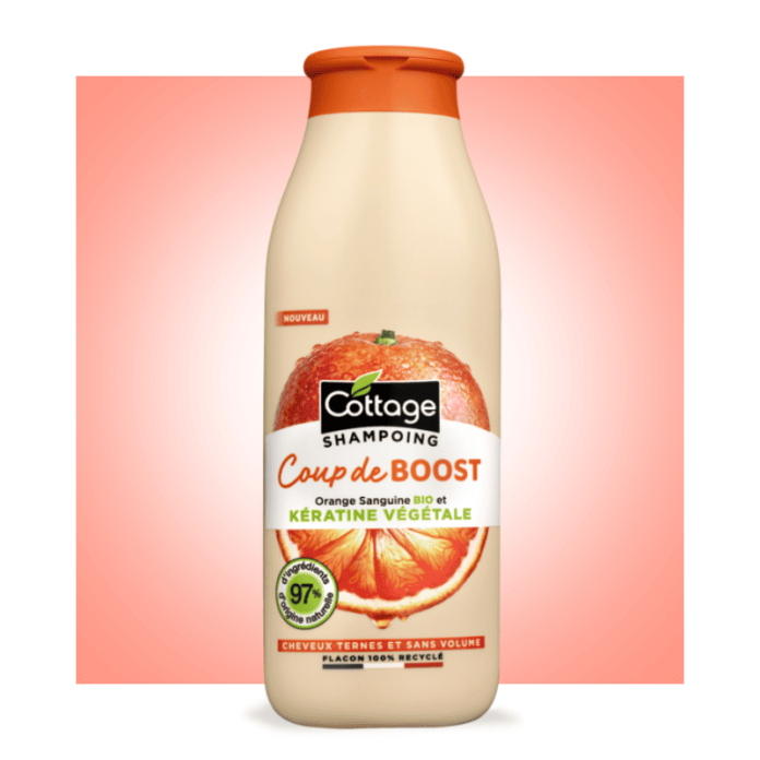 Le shampoing Coup de Boost associe à la kératine végétale un extrait d’orange sanguine bio, riche en antioxydant et vitamine C, pour une formule spécifiquement dédiée aux cheveux ternes et sans volume.